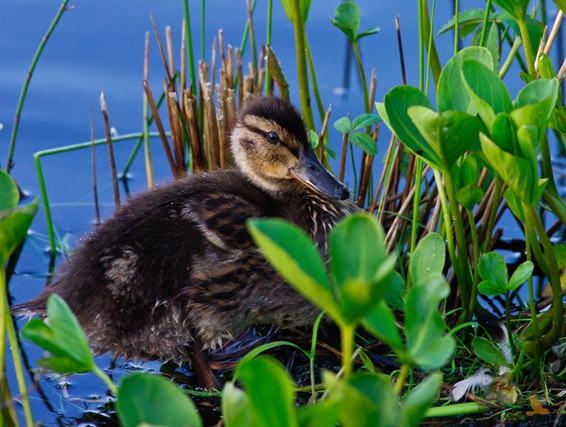 En stolt andemor med flokken sin på svømmetur i solnedgangen.