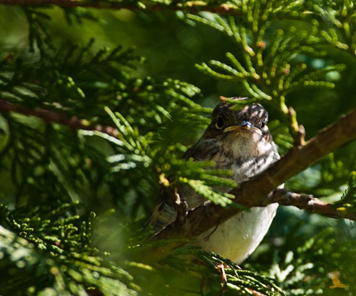 En litt redd, men nysgjerrig svart hvit fluesnapperunge som akkurat har kommet ut fra fuglekassen sin.